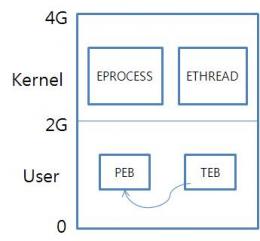 - PEB(Process Enviroment Block) : 프로세스를 관리하기 위해 User Mode에 둔다.